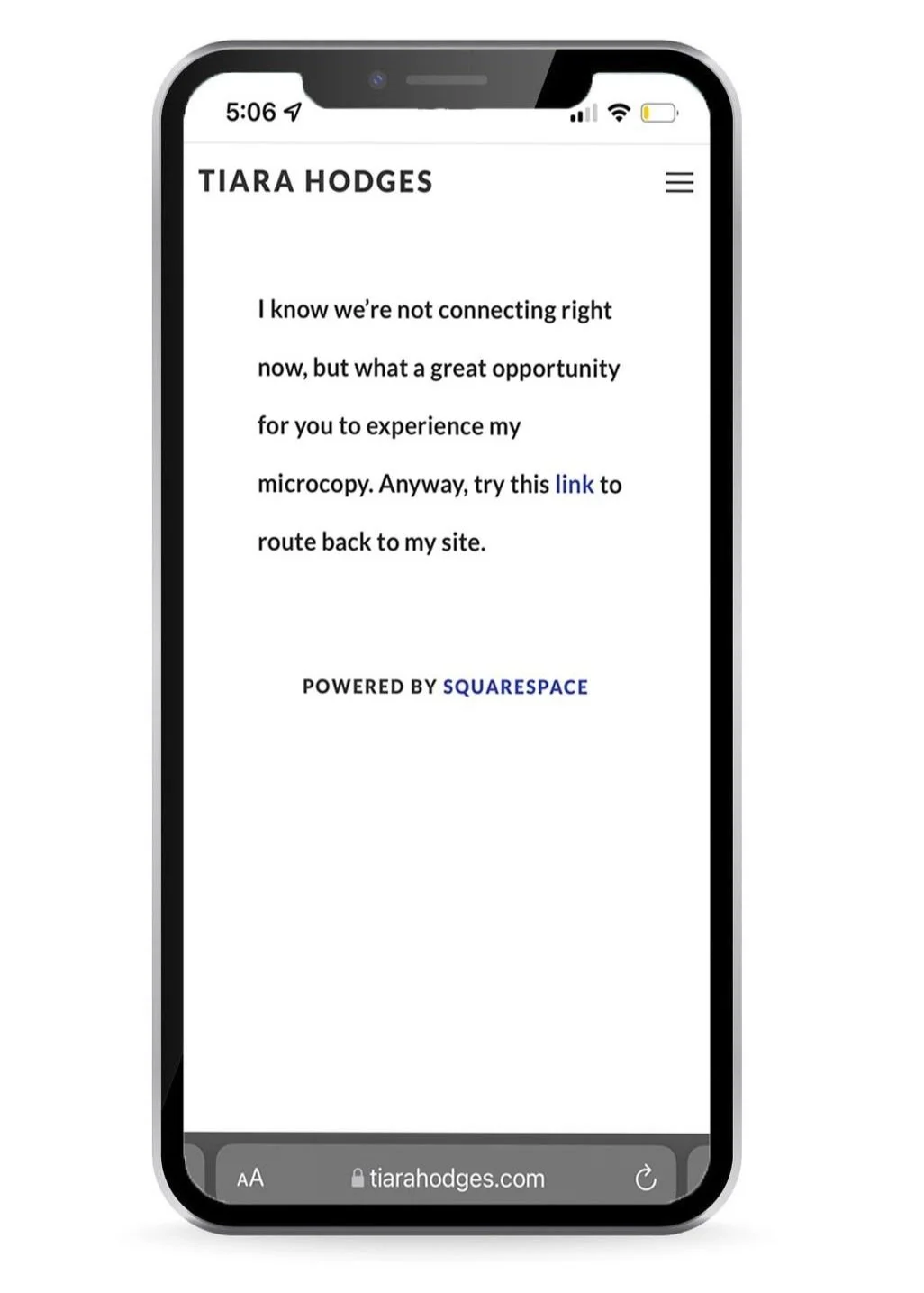 This is the error message for my website. I wanted to create copy that’s conversational and represents me (and hopefully keeps the user on my site 😉).